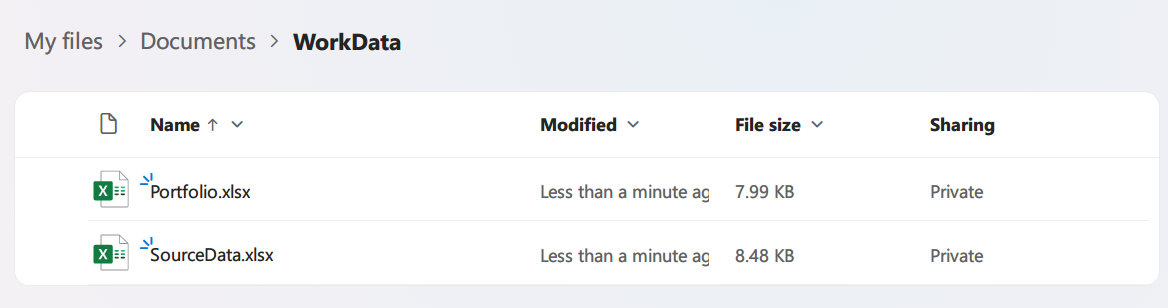 In the context of our preceding example, we MUST make sure that both “SourceData.xlsx” and “Portfolio.xlsx” are residing in the same folder just like the next screenshot.
