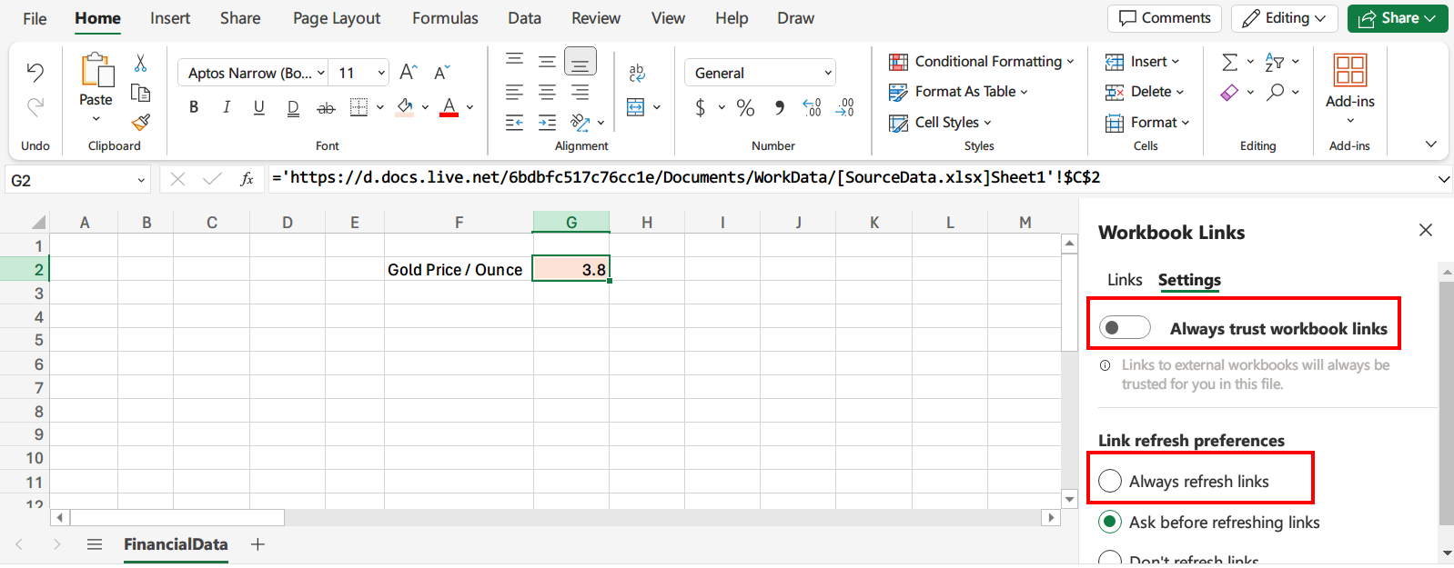 We have an Excel file “SourceData.xlsx” containing the latest Gold Price per Ounce, which is updated every day automatically.